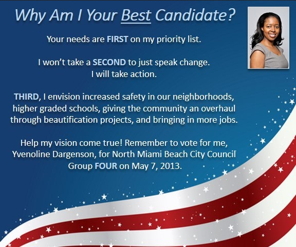 Yvie’s THIRD priority is actually a combination of four things, which is nothing more than a trite laundry list of every candidate’s wishes in every election from the beginning of time until now.  Dargenson actually believes that with a wave of her magic wand she can make North Miami Beach safer, improve our schools, beautify our neighborhoods and bring in more jobs.  I’m surprised she didn’t claim she could lower the national deficit and give free health care for everyone in America.
