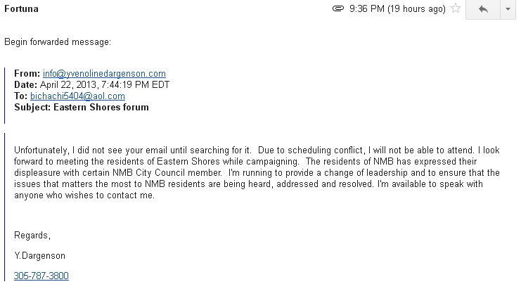 Fortuna waited all afternoon for a return call, which never came.  She did, however, open the following email from Dargenson, which was sent last night at 7:44 pm, nearly 45 minutes AFTER the start of the candidate forum, and which Fortuna forwarded to me: