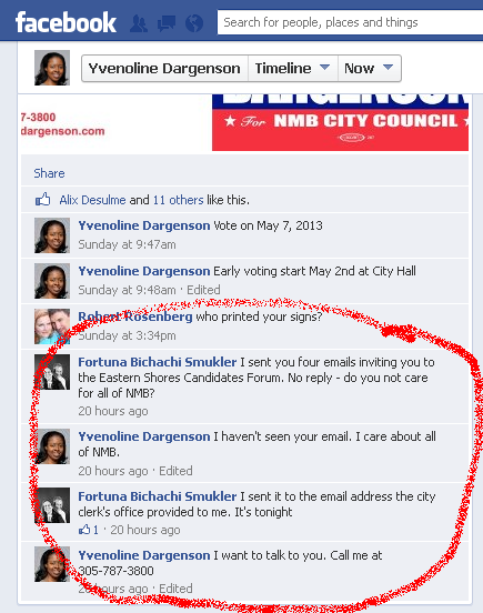 Now, back to the fact that Dargenson couldn’t be bothered to attend last night’s very important candidate forum.  The organizer of the event, Fortuna Bichachi Smukler emailed each and every one of the candidates in order to make sure they knew about it and to secure their acceptance.  When Fortuna didn’t hear back from Dargenson, she contacted her on Facebook, because that’s apparently where Dargenson spends all her spare time.  I took this screen shot at 7:00 am this morning.  Witness the exchange between Fortuna and Yve that took place 20 hours earlier, which was yesterday at 3:00 pm: