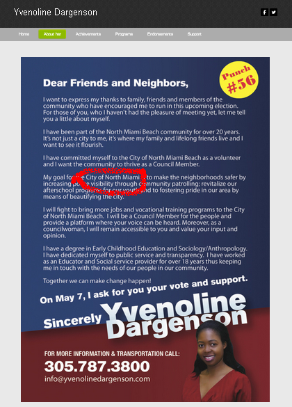So, let’s see. She claims she has worked “for over 18 years” as a service provider in “the community.” That “community” is NOT NORTH MIAMI BEACH! Not only does she NOT live here, but she doesn’t work here, either. She has absolutely NO CLUE what the needs of OUR community are!