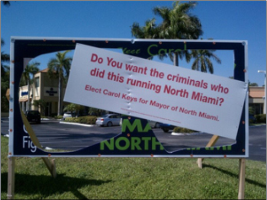 Two years ago, North Miami mayor Andre Pierre was in danger of losing his throne. In fact, he was so desperate to knock challenger Carol Keys out of the race that he allegedly had his henchman destroy 17 of her billboard signs. As CBS Local reported on March 29, 2011, someone took a box cutter and cut out giant holes in her signs in order to keep voters from realizing there was a viable alternative to his thugocracy.