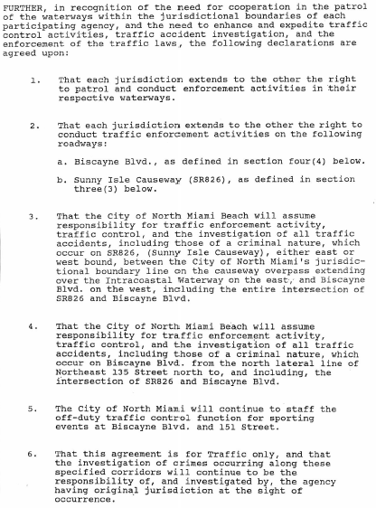 1. Both agencies should patrol their areas of Biscayne, helping each other out whenever necessary. However, according to the agreement, ONLY North Miami Beach cops are to handle all traffic matters on that stretch REGARDLESS of which side of the street they’re on. That is the problem, and that is what makes no sense whatsoever. Neither do our cities’ boundaries.