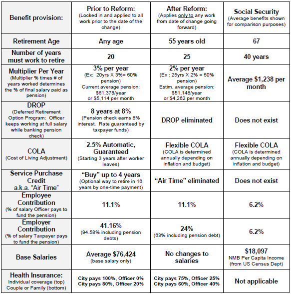 Below is a FACT CHART outlining NMB Police Officersโ€™ Pension benefits, Base salary, and Health Insurance Prior to Pension Reform and After Pension Reform.ย  This will illustrate that the changes are reasonable and continue to be generous for our Officers.