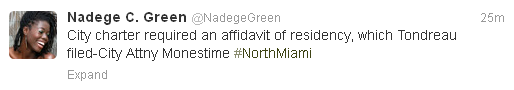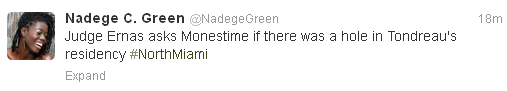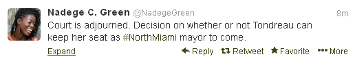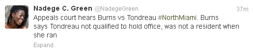 The future of North Miami Mayor Lucie Tondreau’s seat will be decided by a 33 minute appellate court hearing held this morning.  The case of Burns v. Tondreau, et al, was heard this morning by the 3rd District Court of Appeals.  A decision was not rendered at the hearing, and according to Miami Herald reporter Nadege Green’s Tweets, the Judge gave no indication when he will make it public.
