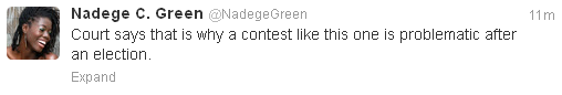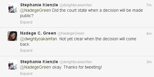 For those of you who don’t “do” Twitter (for shame!), here are Nadege’s Tweets from this morning’s hearing: