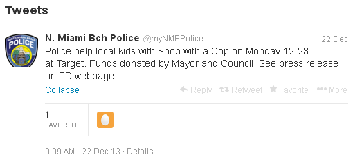 I then also checked the North Miami Beach Police Department’s Twitter page. Also nada! In fact, the most recent Tweet by the NMBPD was on December 22, 2012: