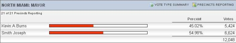 Posted in North Miami Beach North Miami Special Election Official Results Stephanie Kienzle November 4, 2014 3 Comments The results are in. The final tally in the race for Mayor of North Miami are: The Doctor is in the house! Congratulations to North Miami Mayor Smith Joseph! Stephanie Kienzle “Spreading the Wealth”